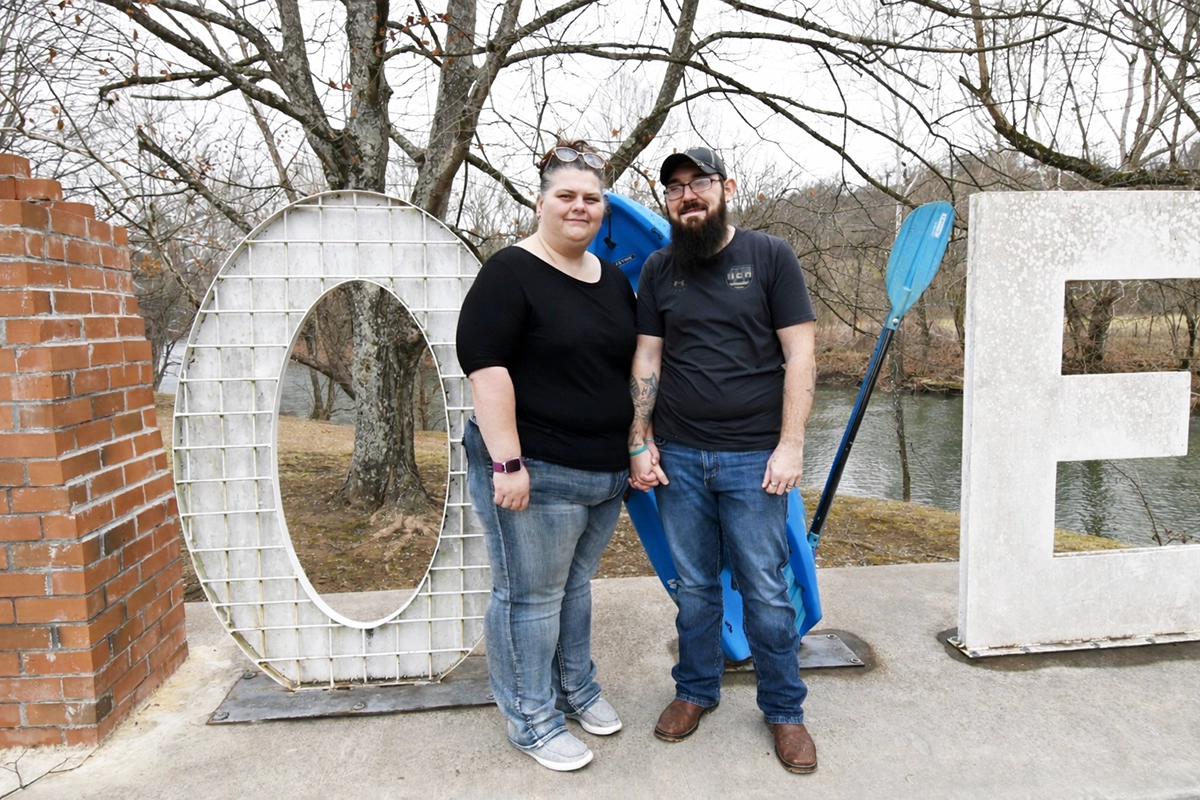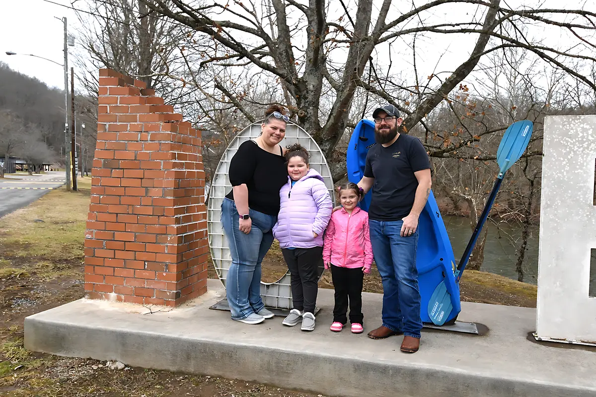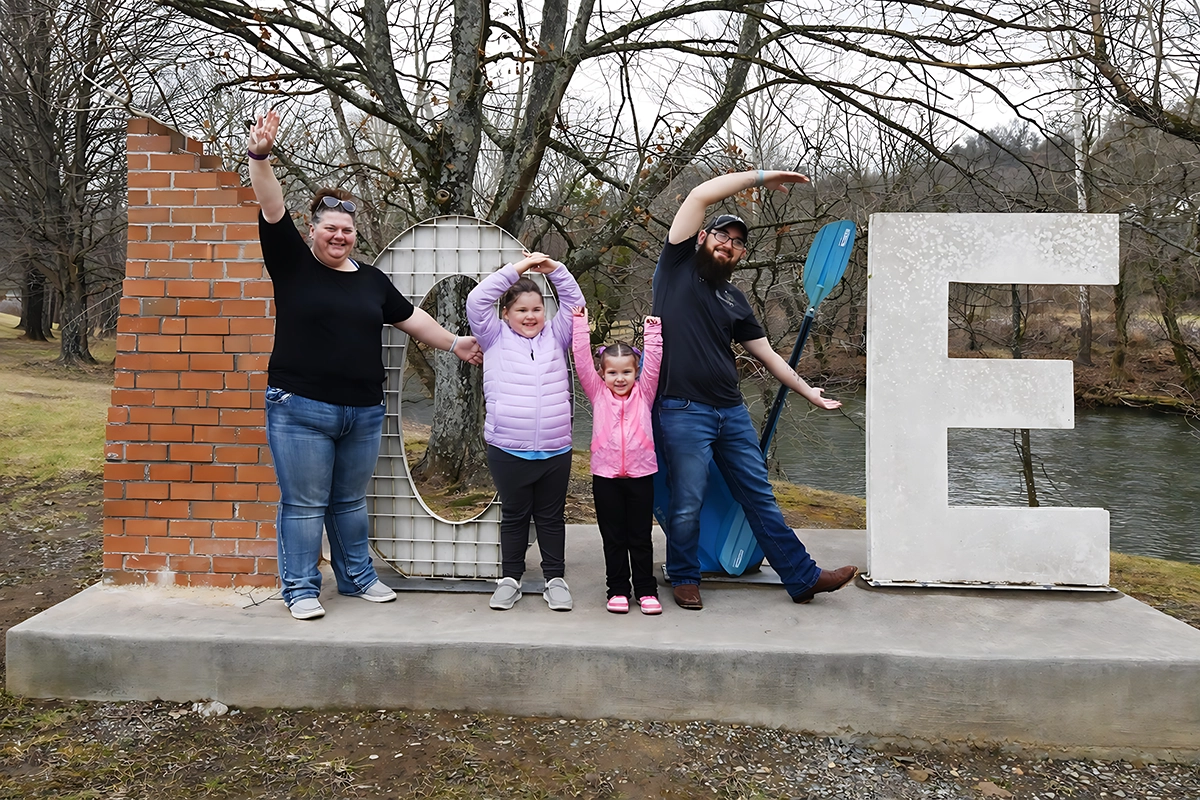 Sarah Hess and her husband stand with their children at the LOVE sign in St. Paul, Virginia, celebrating family and community.